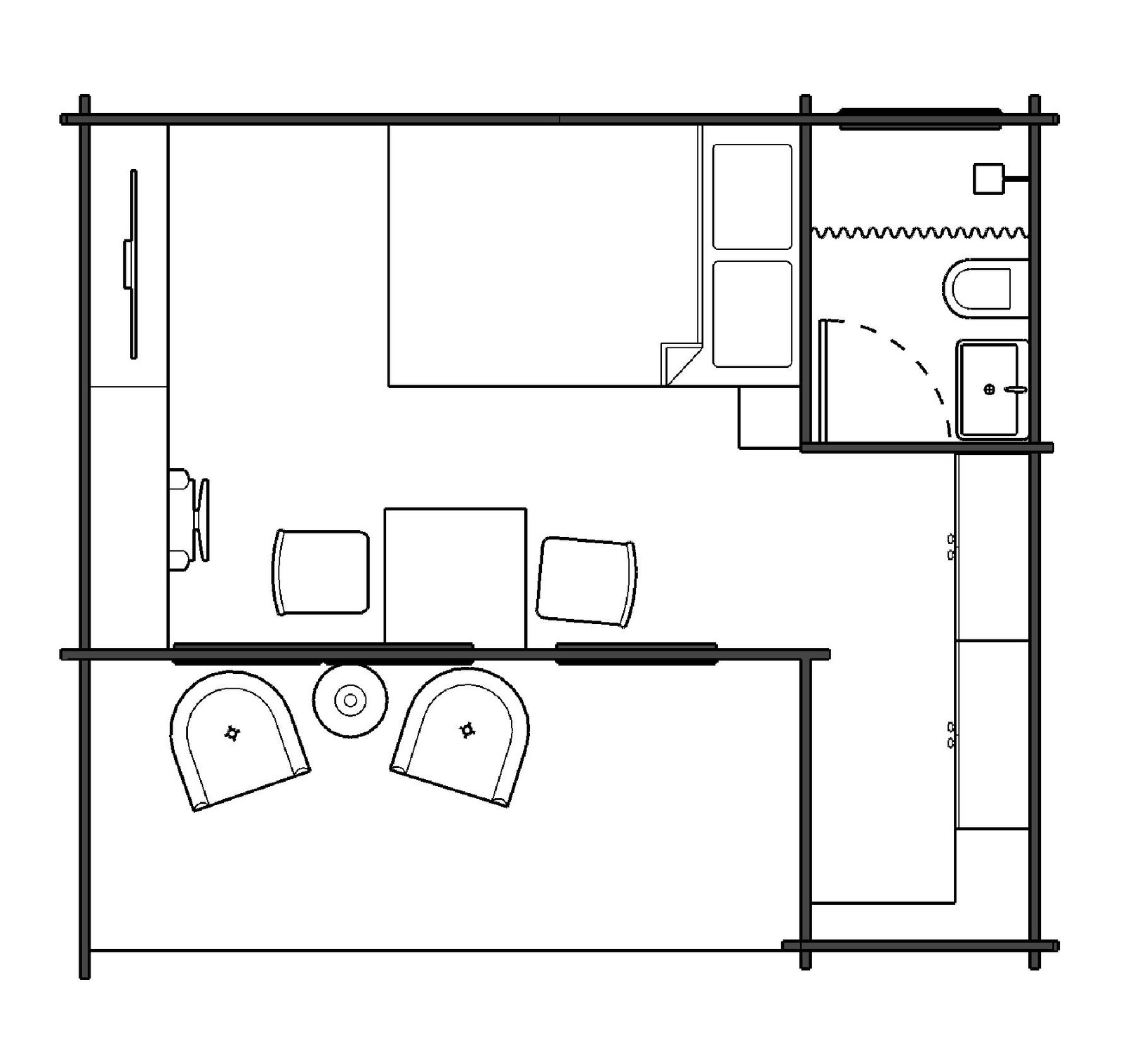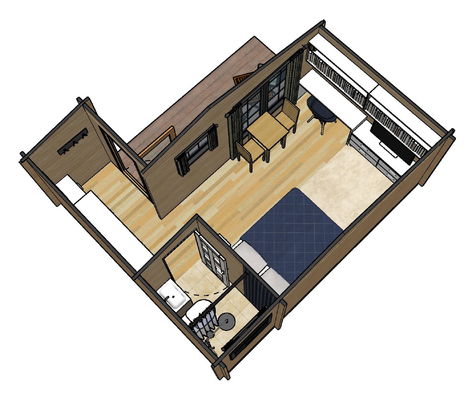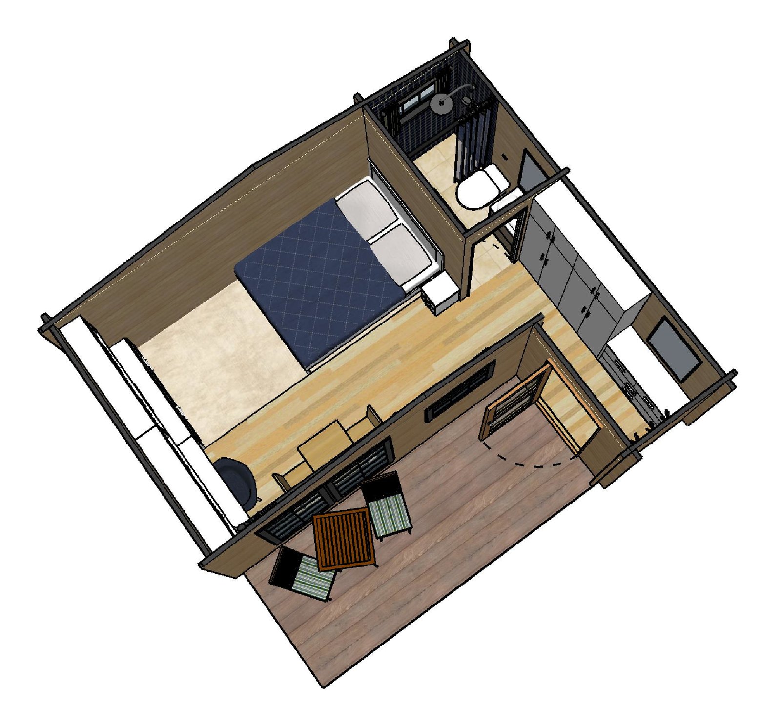 A well planned wooden cottage that can comfortably accommodate 1-2 people. Attached bathroom area. Entry hall with space for plenty of wardrobe storage space, A queen sized double bed can be fitted perfectly.