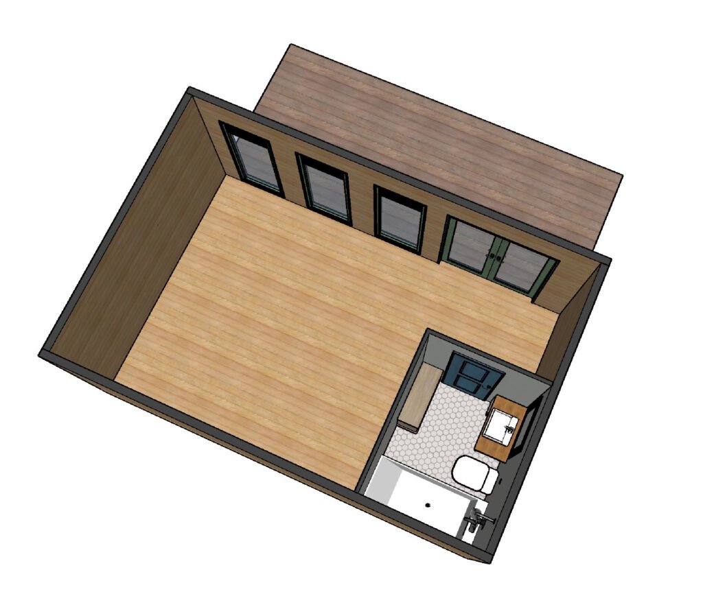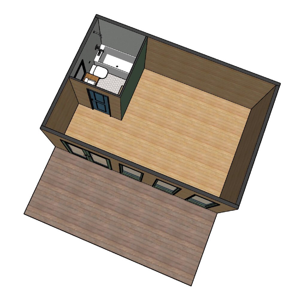 A contemporary design with a wide front holding large windows. Attached bathroom area near the entrance.